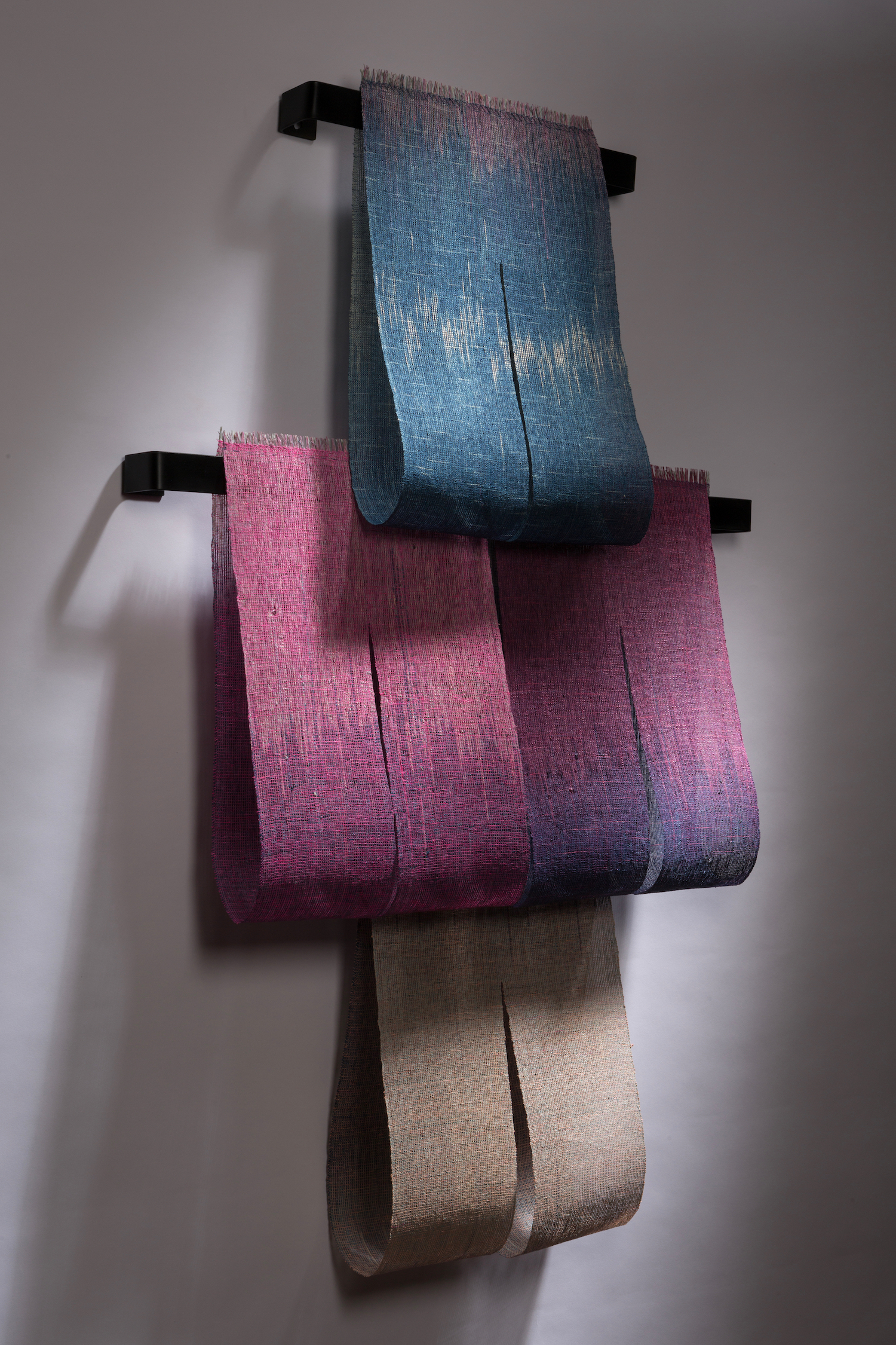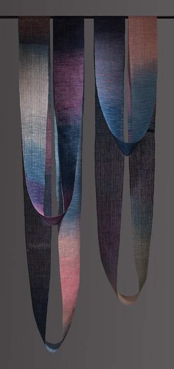 In the Pink Cloud Series I continue to explore the theme of grouping sculpted woven forms into different shapes. Pink Cloud Series 1, 2, and 3 are woven from unique yarns sourced in Japan; viscose coated raw silk and pine paper. The warp was dyed in collaboration with master dyer Rowland Ricketts, professor at Indiana University. In addition, the warp and weft are painted with watercolor pigment in shades of coral and rose.
