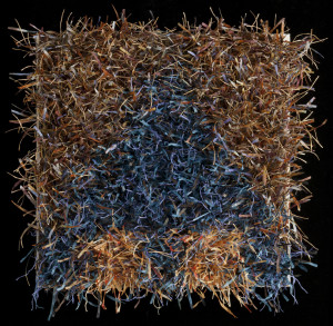 Paper House 1. 13w x 13l x 3d. Woven linen ground, knots of linen, pine, bamboo and silk paper yarns.