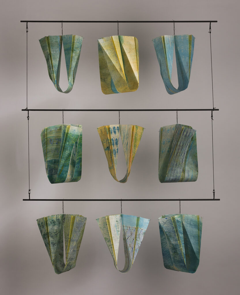 Chimera. Chimera is made of 9 collograph mixed media watercolor and oil monotypes, folded into forms, hung from metal rods. They twist and sway on the breeze. Printed on both sides of light weight Japanese kozo paper, the printing on the back shows through the front and vice-versa. The qualities of transparency and light are at play.