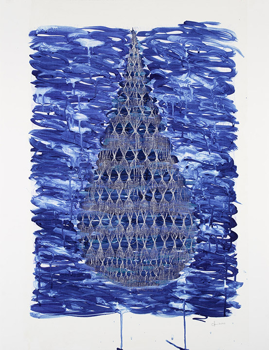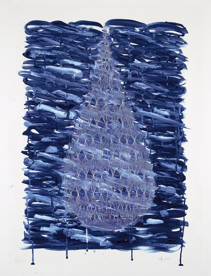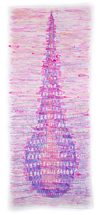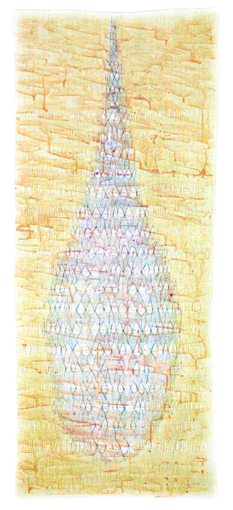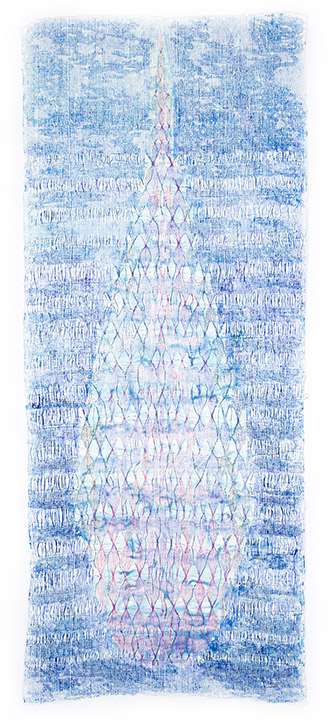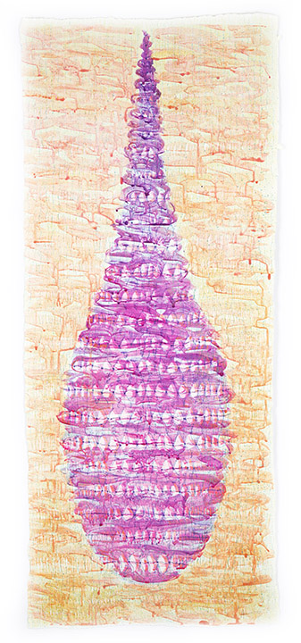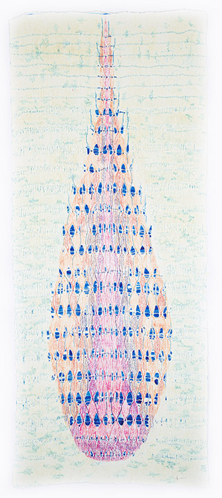 This series evolved out of a completely different project that I had on the loom. As I was weaving, I realized that it would be beautiful to use the warp at hand to create an elongated oblong form. A drop. A teardrop, maybe. Off I went, weaving four different iterations of this shape, in an intricate gauze tapestry pattern.
