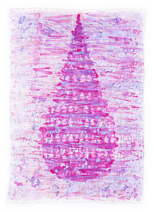 Chimera. Chimera is made of 9 collograph mixed media watercolor and oil monotypes, folded into forms, hung from metal rods. They twist and sway on the breeze. Printed on both sides of light weight Japanese kozo paper, the printing on the back shows through the front and vice-versa. The qualities of transparency and light are at play.