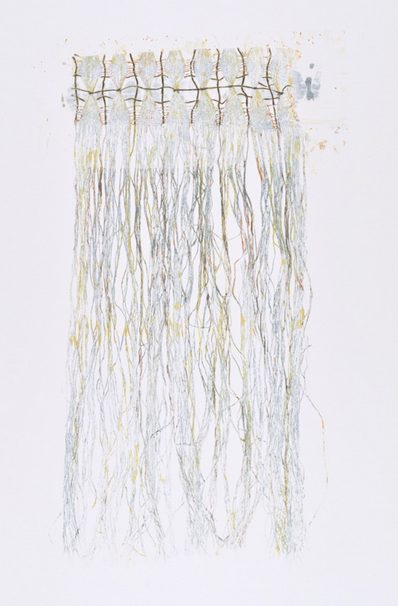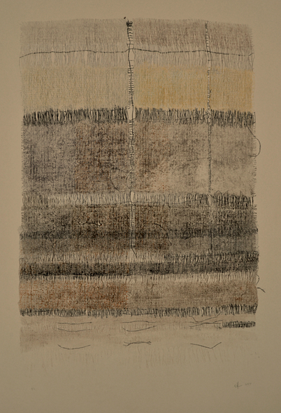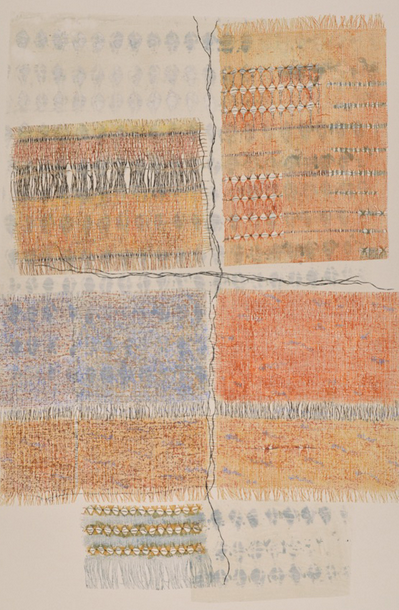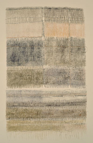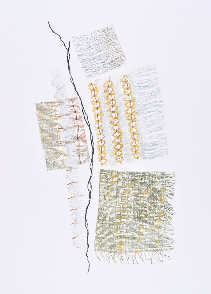 Looking at the resultant woven works, I realized that the image would make an amazing print. Sue agreed. It is hard to sacrifice a woven form to the printmaking process, but there is a big tradeoff in the number of resulting images that can be made, and the textile plate, once used, becomes a thing of beauty itself. To further distinguish the long drop prints, the edges of the print have been cut and torn in the shape of the woven textile plate. This emphasizes the quality of print as object.