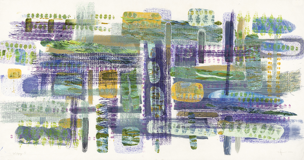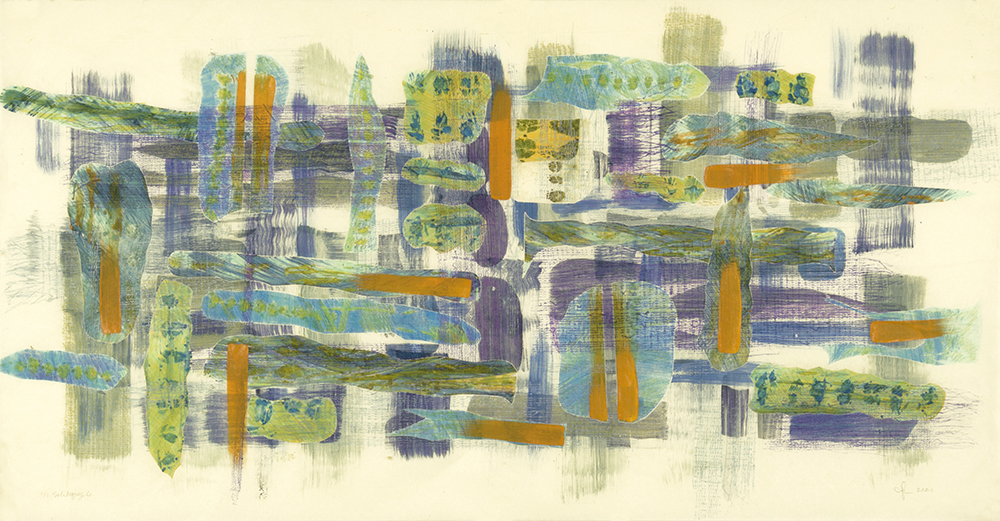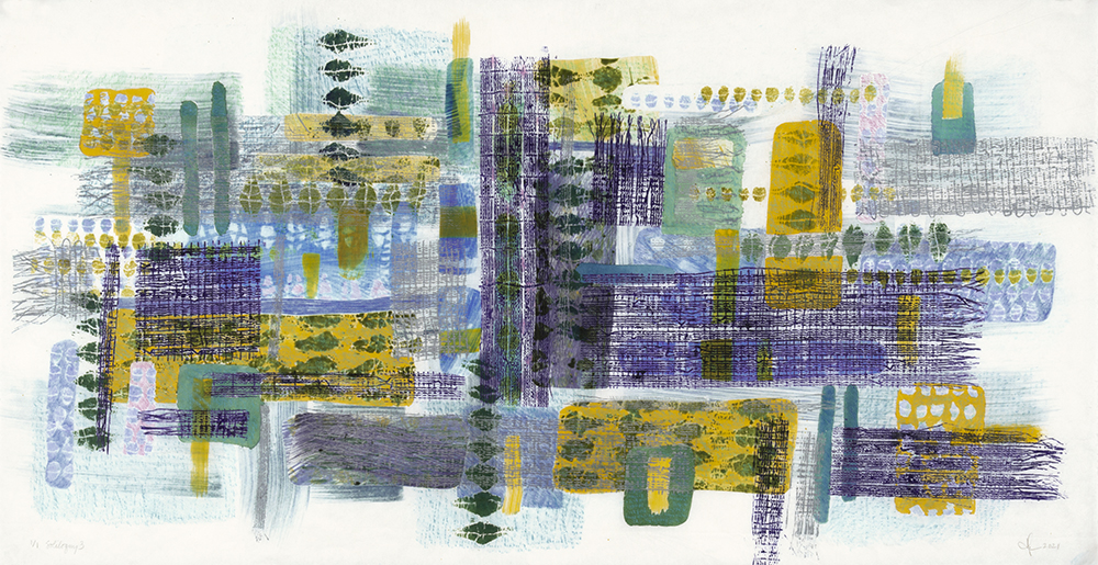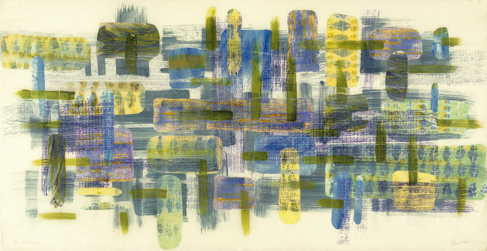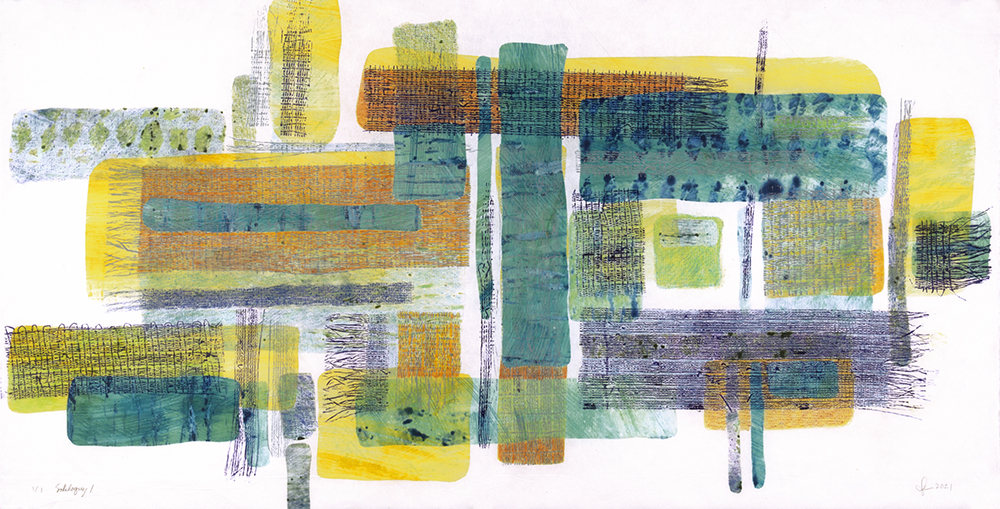 Soliloquy. The Soliloquy print Series make me think of the ever-changing play of light on water, and the way that sometimes you can see the bottom of a lake, its surface, and the reflection of the sky— all at once. These prints were made just as Covid-lockdown was lifting. Soliloquy reflects the lonely feeling of that time.